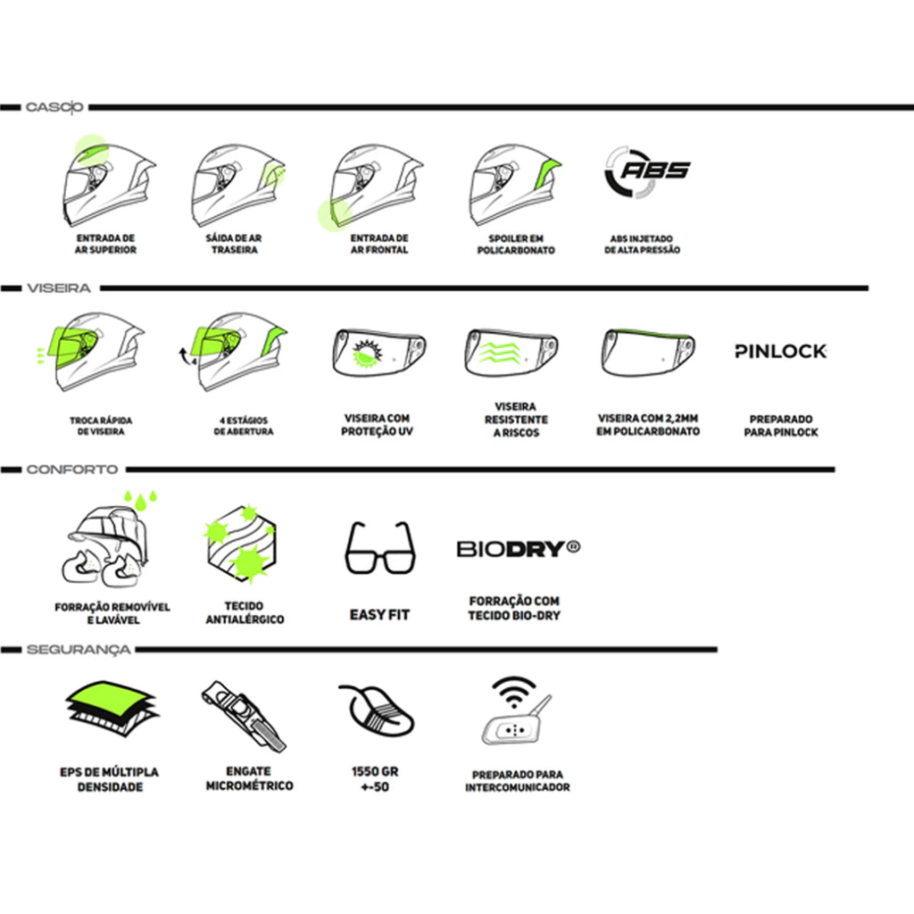 E tem mais: o capacete vem com forração EXTRA CONFORT, que você pode remover e lavar, feita de um tecido antialérgico. Ah, e se você curte intercomunicador, tem espaço pra isso também! O material é composto de fibras naturais com poliéster, com propriedades antibacterianas e ótima absorção de umidade. A cinta jugular é reforçada, com ajuste micrométrico e uma alça de resgate, pra te ajudar a tirar a forração em caso de acidente, garantindo que você esteja sempre seguro na estrada.