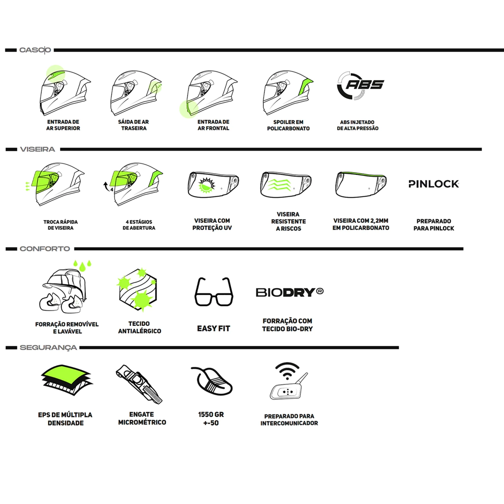 • Casco: Feito de ABS, oferecendo resistência e durabilidade