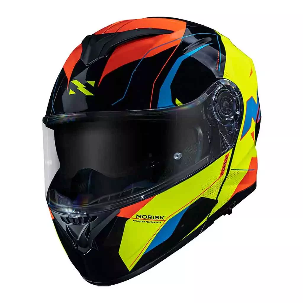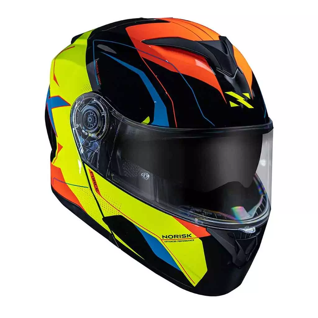 Com excelente campo de visão e viseira de policarbonato com 2,2 mm tratada para maior resistência a riscos e marcas, também oferece óculos interno escuro com proteção UV, facilmente acionado na lateral inferior esquerda do capacete. O acabamento também é um dos destaques do Norisk Force, que possui forração em poliéster removível, lavável e com tratamento hipoalérgico.